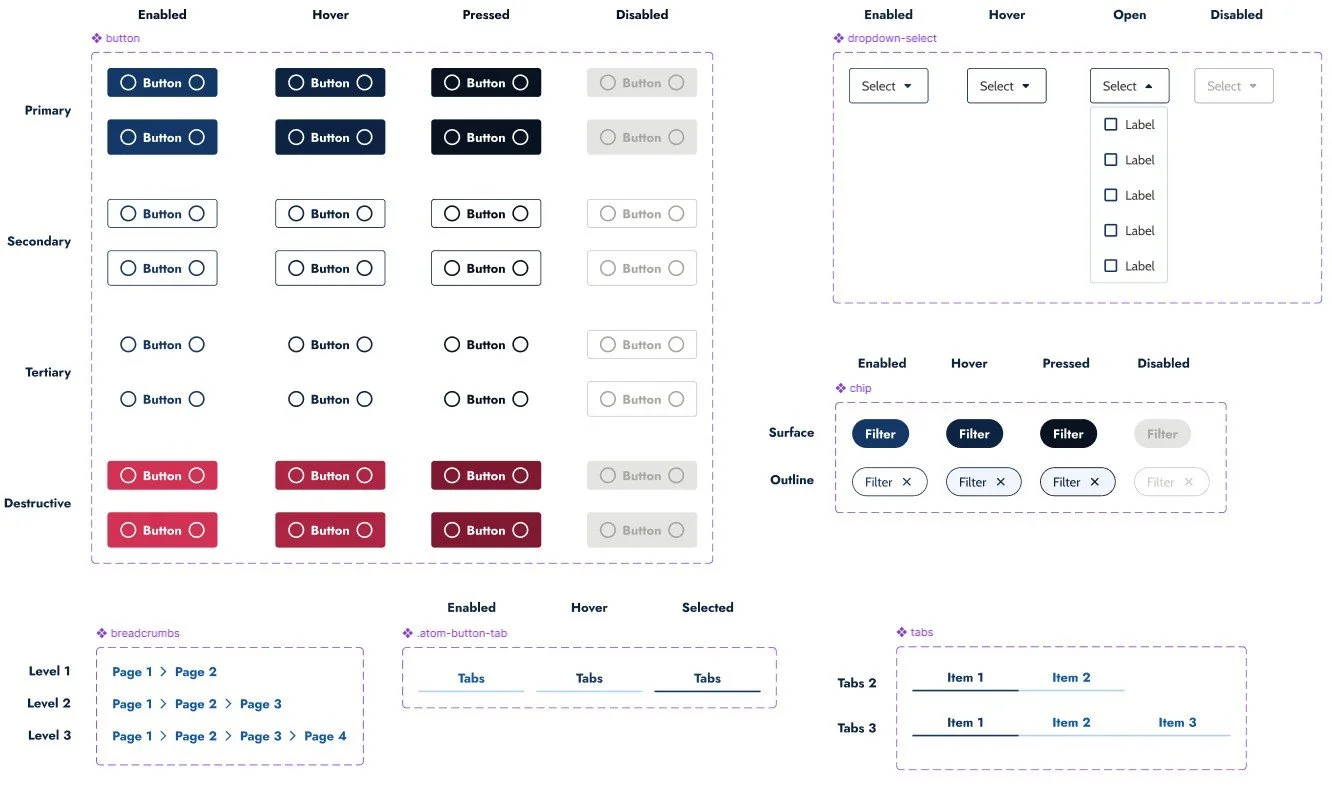 We applied Atomic Design to ensure the Design System is both scalable and maintainable over time. Components were documented with their full range of states, and built with predefined, flexible properties to support quick customization.